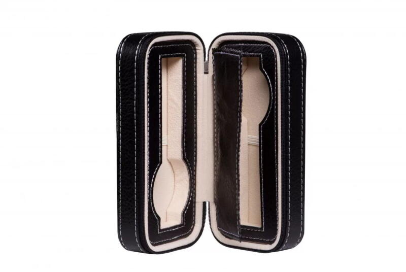 908 Fekete műbőr utazótok 2db órának Referenciaszám 908gényes utazótok 2 karórához jó minőségű mesterséges bőrből fekete színben vastag fehér varrássalPraktikus méret zippzáros Masszív és bélelt kialakításának köszönhetően biztonságosan szállíthatja óráitA belső kialakítás 140 mm hosszan akár 35 mm széles óraszíjjal és55 mm-estokátmérővel is kényelmesKülső méretei 180mm széles90mm mély55mm magas