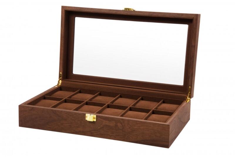 Natúr barna fa óratartó óradoboz 12 óra számára Arany színű zsanérok belseje sötétbarna színű mikroplüssKülső méreteiSzélesség 345cmMélység 20cmMagasság 8cmFakk méreteSzélesség 50mm
