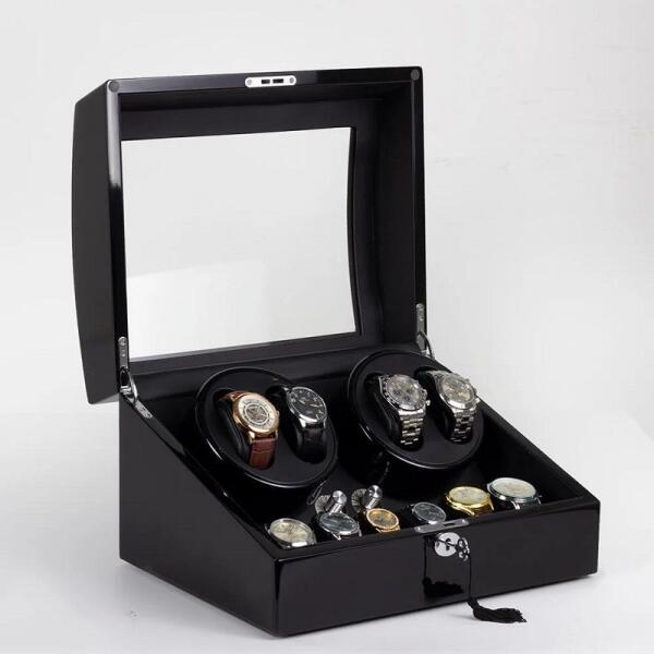 TermékleírásGyártó Dukwin Modell R2461BA Dukwin R2461B egy prémium kategóriás automata óraforgató, amelyet igényes óragyűjtők és -tulajdonosok számára terveztek. Ez a modell egyszerre négy automata karóra felhúzására képes, miközben további hat órának biztosít tárolóhelyet, így összesen tíz óra tárolását és gondozását teszi lehetővé.  Ideális választás azok számára, akik több automata órát birtokolnak, és szeretnék azokat folyamatosan működőképes állapotban tartani. A csendes működésnek köszönhetően hálószobában vagy irodában is használható anélkül, hogy zavaró lenne. Az állítható fordulatszám és forgásirány lehetővé teszi, hogy különböző óratípusokhoz igazítsa a működést, így minden óra optimális gondozásban részesül. Az extra tárolóhelyek révén nemcsak az automata órák, hanem a kvarc órák vagy egyéb ékszerek is biztonságosan elhelyezhetők benne. Jellemzők