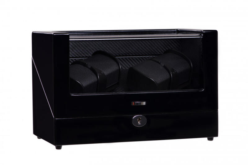 Több rétegben lakkozott fekete színű, fából készült óraforgató 4 órához. Kialakításának köszönhetően nagy méretű óráknak is megfelel. Belseje fekete karbon színű. A termék hálózatról és elemről egyaránt üzemel. Zárható, kulcs és hálózati adapter tartozék. A bal oldali kettő és a jobb oldali kettő fej együtt irányítható. A modell több programbeállítási lehetőséggel ellátva: 1. Óramutató járásával megegyezően forog 6 percet, majd 30 percet pihen, 2. Óramutató járásával ellentétesen forog 6 percet, majd 30 percet pihen, 3. Óramutató járásával ellentétesen forog 20 percet, majd pihen 10 percet, ezután óramutató járásával megegyezően forog 20 percet, majd ismét 10 percet pihen, 4. Óramutató járásával megyezően forog 6 percet, majd pihen 30 percet, ezután óramutató járásával ellentétesen forog 6 percet, majd ismét 30 percet pihen. Külső méretei: szélessége 29.5cm, magassága 20cm, mélysége 16,5cm. Párnák szélessége 52mm/db.