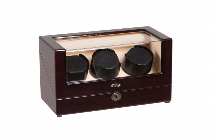 Több rétegben lakkozott mahagóni színű, fából készült óraforgató 3 órához. Kialakításának köszönhetően nagy méretű óráknak is megfelel. Belseje törtfehér színű. A termék hálózatról és elemről egyaránt üzemel. Zárható, kulcs és hálózati adapter tartozék. A jobb oldali és a középső fej együtt, a bal oldali fej pedig külön irányítható. A modell több programbeállítási lehetőséggel ellátva: 1. Óramutató járásával megegyezően forog 3 percet, majd 28 percet pihen, 2. Óramutató járásával ellentétesen forog 3 percet, majd 28 percet pihen, 3. Óramutató járásával ellentétesen forog 3 percet, majd pihen 10 percet, ezután óramutató járásával megegyezően forog 3 percet, majd ismét 10 percet pihen, 4. Óramutató járásával megegyezően forog 10 percet, majd óramutató járásaval ellentétesen forog 10 percet, ezt ismétli egy órán keresztül, majd ezután 4 órát pihen. Külső méretei: szélessége: 32.5cm, magassága 18cm, mélysége 16cm. Párna mérete: 67x75mm.