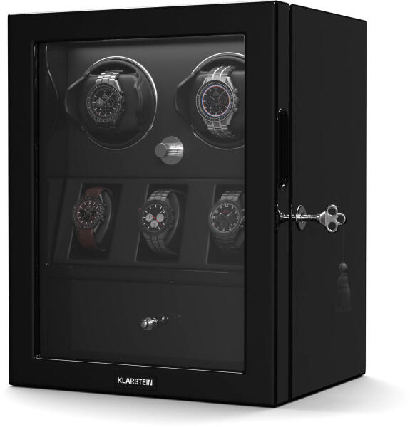 A Klarstein ChronoVault órafelhúzó egy luxusmegoldás mechanikus és automata órák tárolására és karbantartására. Elegáns kialakításával és modern technológiájával tökéletes kiegészítő az órák szerelmeseinek. A Klarstein ChronoVaultórafelhúzójamagasfényű felületével és vegán bőr belső bélésével nyűgöz le, amely elegáns megjelenést kölcsönöz neki. A rendkívül csendes japán motor gondoskodik arról, hogy az óra mindig csendesen és hatékonyan legyen felhúzva. A ChronoVault négy különböző forgatási móddal és három irányváltoztatási lehetőséggel a legtöbb mechanikus óra számára biztosítja a szükséges rugalmasságot. Az ékszerek és egyéb kiegészítők kényelmesen tárolhatók a beépített, kivehető rekeszekkel ellátott fiókban. A fehér LED-ek megvilágítják az órát, és elegáns megjelenést kölcsönöznek a ChronoVaultnak. Helyezze az órafelhúzót stabil felületre, és rendszeresen tisztítsa meg puha kendőcskével, hogy megőrizze a fényes felületet. Tapasztalja meg a Klarstein ChronoVault óratekercselő fényűzését, és rendelje meg a sajátját még ma!