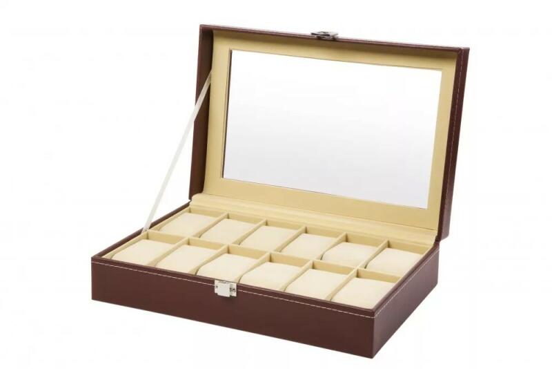 Műbőr óratartó doboz, óradoboz 12 óra tárolására barna színben, fehér varrással! Belseje világos színű szövet.