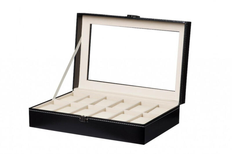 Műbőr óratartó doboz, óradoboz 12 óra tárolására fekete színben, fehér varrással! Belseje világos színű szövet.