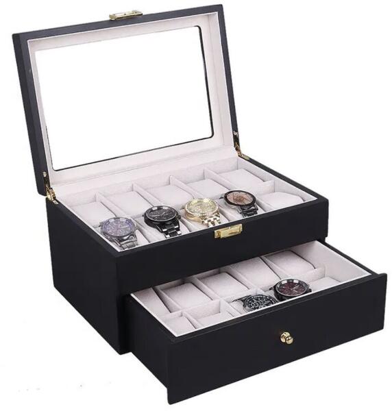 20 Órás Luxus Óra Tároló: Elegáns Fa Órarendező Fiókkal Ez a gyönyörű, fekete fa óra tároló tökéletes helyet biztosít értékes óráinak. A Pufo Premium modell két fiókkal rendelkezik, amelyekben 20 órát helyezhet el biztonságosan és stílusosan. A felső rész üveg teteje lehetővé teszi az óragyűjtemény megtekintését anélkül, hogy ki kellene nyitni a dobozt. ✨ Főbb jellemzők:20 óra tárolására alkalmas: Két fiókban, 10-10 órának helyet biztosítva. Prémium minőségű bársony bélés: Az órák védelmére és elegáns megjelenésére. Lakkozott fa és üveg külső: Tartós és elegáns megjelenés. Fiókos kialakítás: Praktikus és rendezett tárolás. Méretek: 29 cm x 21 cm x 16 cm Súly: 2530 g Miért válassza ezt az óra tárolót?Védi óráit: A bársony bélés megakadályozza a karcolódást és a sérüléseket. Elegáns megjelenés: Tökéletesen illeszkedik bármely otthoni környezetbe. Praktikus tárolás: Könnyen megtalálhatja a kívánt órát. Tökéletes ajándék: Kiváló választás óragyűjtőknek és óráikat szerető személyeknek. Rendelje meg most, és tartsa óráit biztonságban és stílusosan! ?